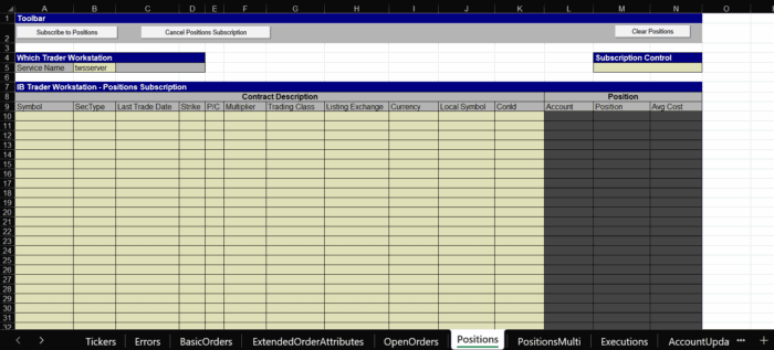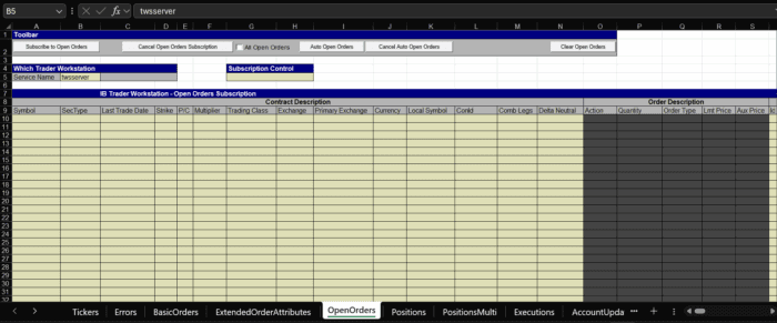 After launching the socket bridge and while having TWS open and all the necessary API settings are set on it, as show in Configure Trader Workstation for DDE, we can then locate and open our sample sheet. Navigate to C:TWS APIsamplesExcel and select “TwsDde.xls”.